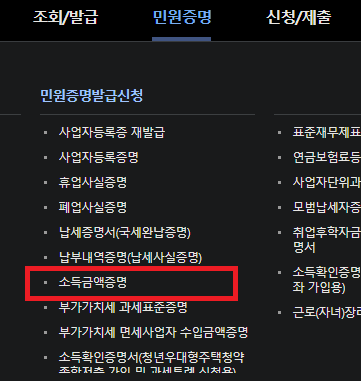 민원증명 -> 소득금액증명을 클릭.
